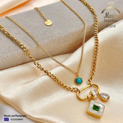 81014 كوليه جولد ستانلس عيار 316 مربع صدف فص باجت اخضر و فيروزي